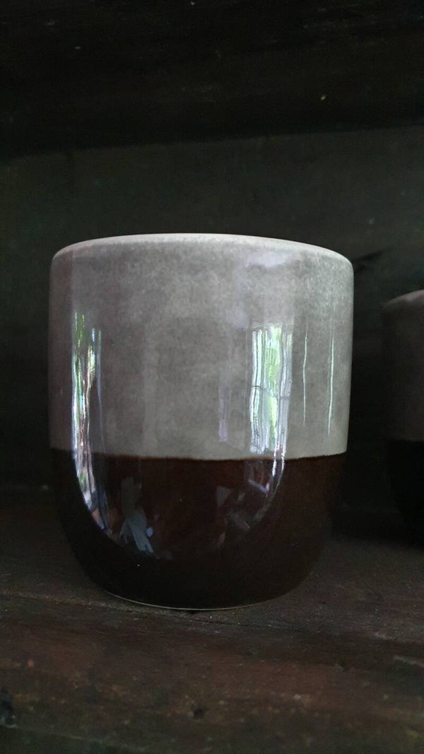 Fijn Koffiemokje handmade. Prachtig warme kleur. Heel donkerbruin ( tegen zwart aan), bovenste gedeelte warm grijs. Goed voor espresso, cappuccino of een senseo.
