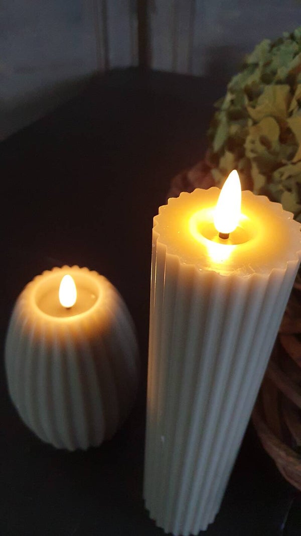 Recht geribbeld model led kaars van echte wax. Werkt op 2 AA batterijen. Met timer. Soft Grey