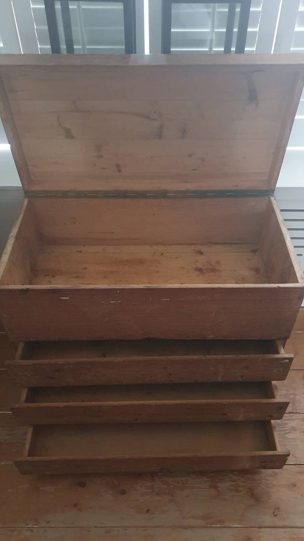 Stoere kist met klep en 3 flinke lades met sleets uiterlijk.Prachtig oud grenen! Super leuk om knutsel/teken spullen in op te bergen. Ook handig in een hal voor de sjaals en handschoenen bijvoorbeeld. Mogelijkheden genoeg met deze unieke kist!