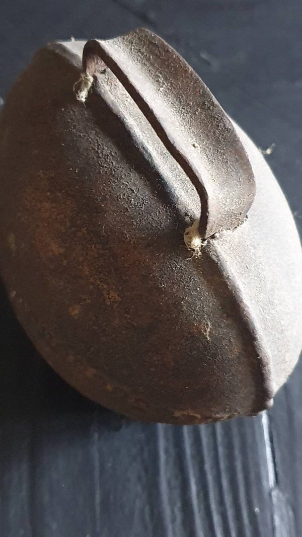 Oude koeienbel, mooi geroest daardoor stoer in een krans of toef. Of aan een shabby doek of lint.