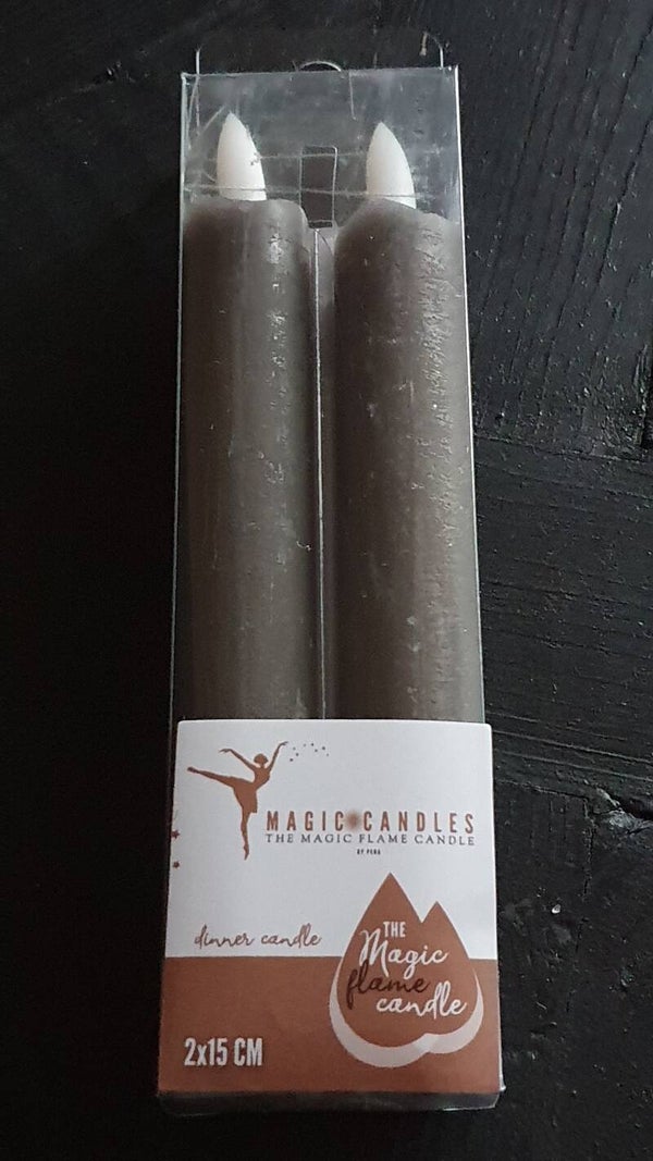 Donkergrijze ledkaars van wax met rustiek uiterlijk. Twee stuks in verpakking. Werkend op 1 AAA batterij, niet inbegrepen.