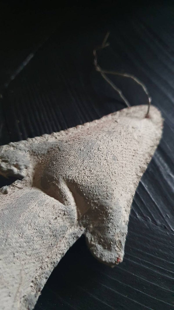Kerstboompjes (sparren) gemaakt van stof en daarna in de kalkverf gezet. Bij enkele zit een hanger aan. Leuk om neer te zetten ggroepeerd of een enkele aan een krans.