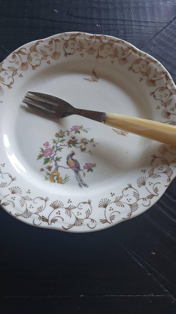 Brocante gebaksvorkjes. Gemeeleerd grijs/groenig/beige/ivoortint.