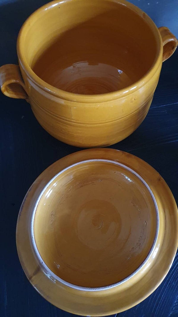 Prachtig geglazuurde schaal met deksel uit Zuid Frankrijk, Provence. Warm okergeel.
