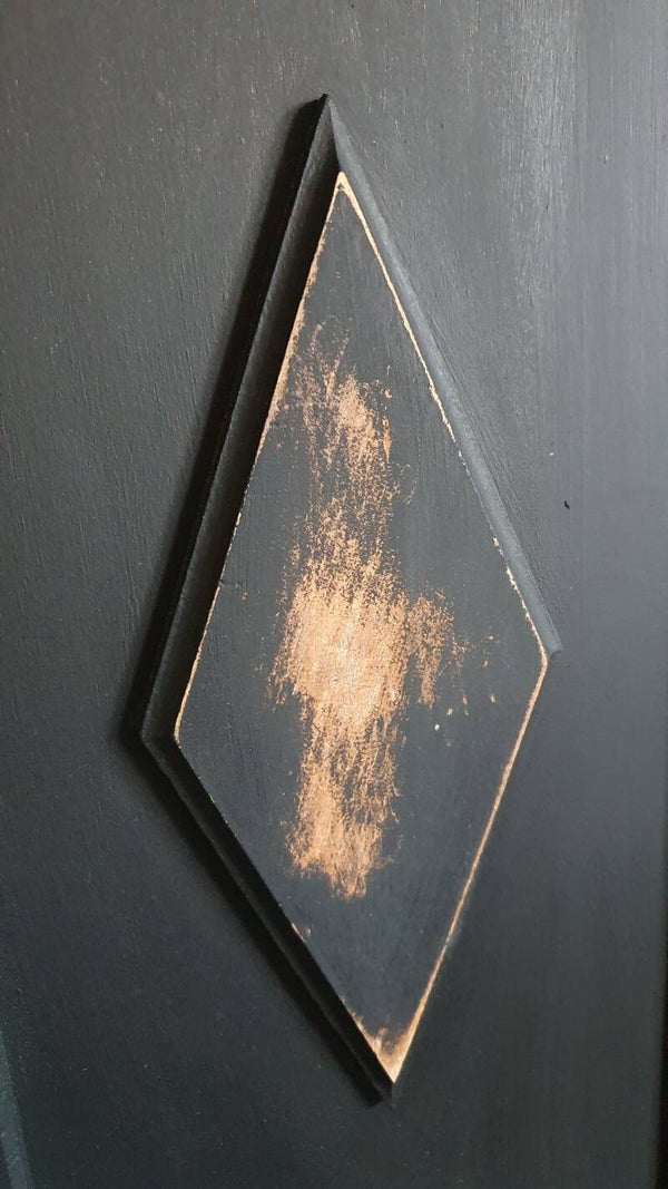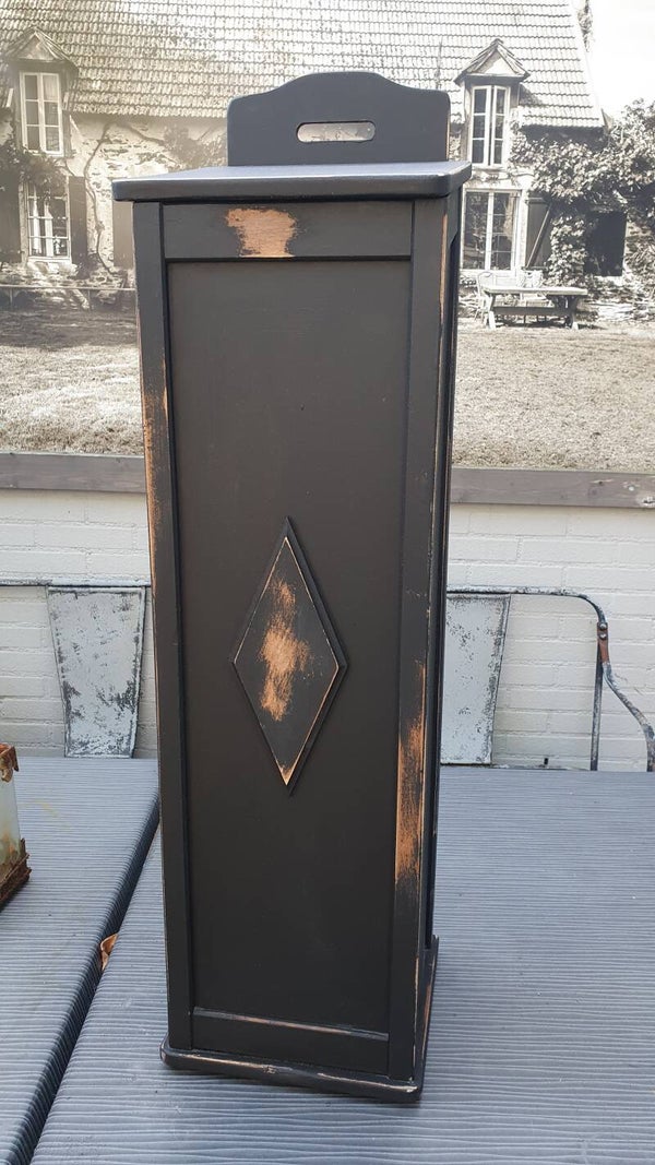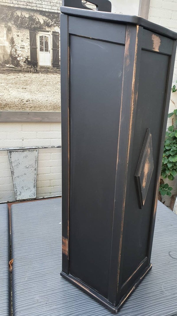Matzwarte eiken kast om stokbrood in te bewaren.
