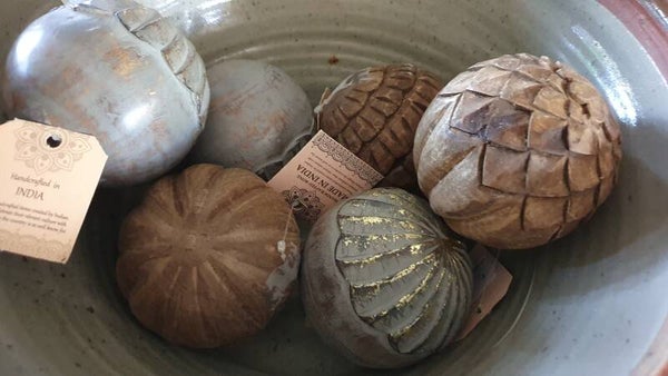 Grote houten bal grijs met een laagje goud. Leuk op een schaal of onderbord.