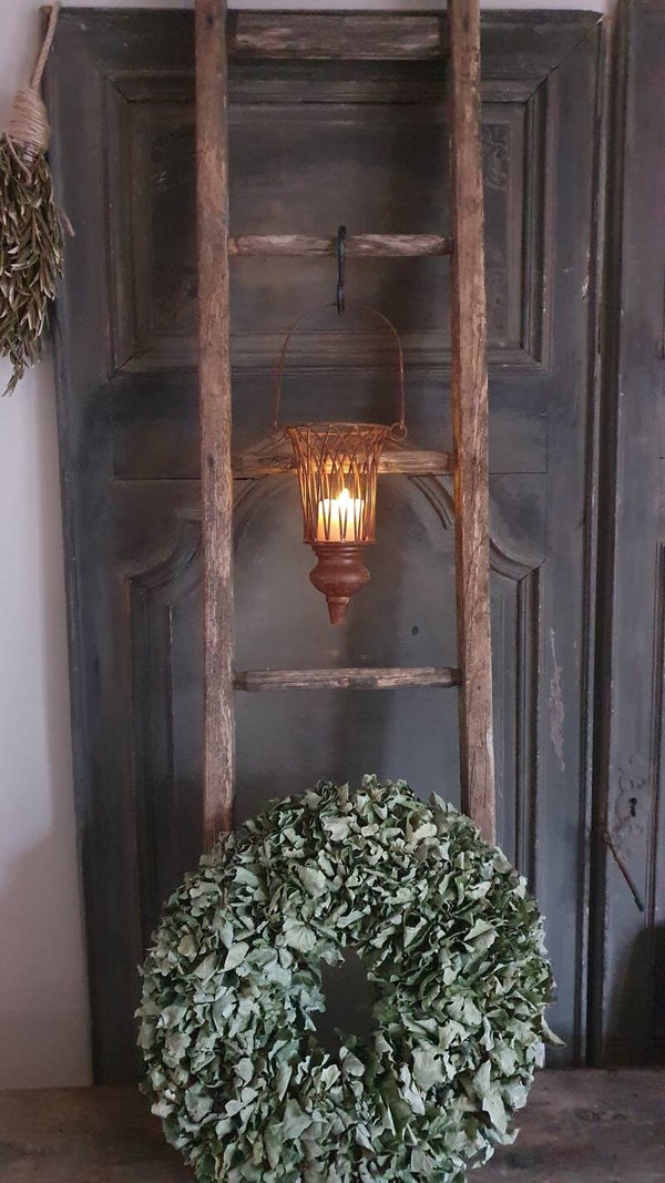 Stevige eiken ladder. Handig in de badkamer met een handdoek of ter decoratie in een andere kamer. In de keuken met bosjes kruiden of een knoflookstreng is ook een ideetje.