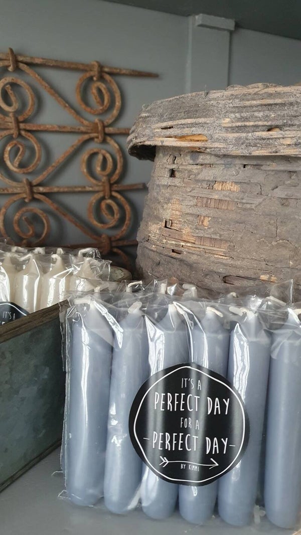 Pakje van 6 kleine dinerkaarsen in vergrijsd blauwe tint.