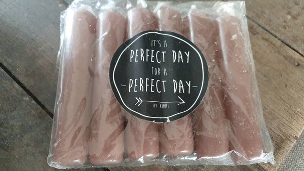 Pakje van 6 kleine dinerkaarsen ineen warme donkerroze kleur grape. Van de drie kleuren roze is dit de donkerste tint.