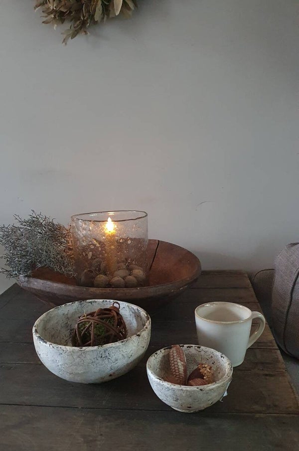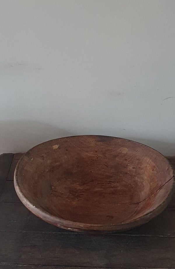Stevige (ondanks scheur) robuuste houten schaal. Leuk in de keuken met uien/knoflookbollen of fruit maar ook stoer met wat (kunst)groen en een windlicht. Mogelijkheden over!