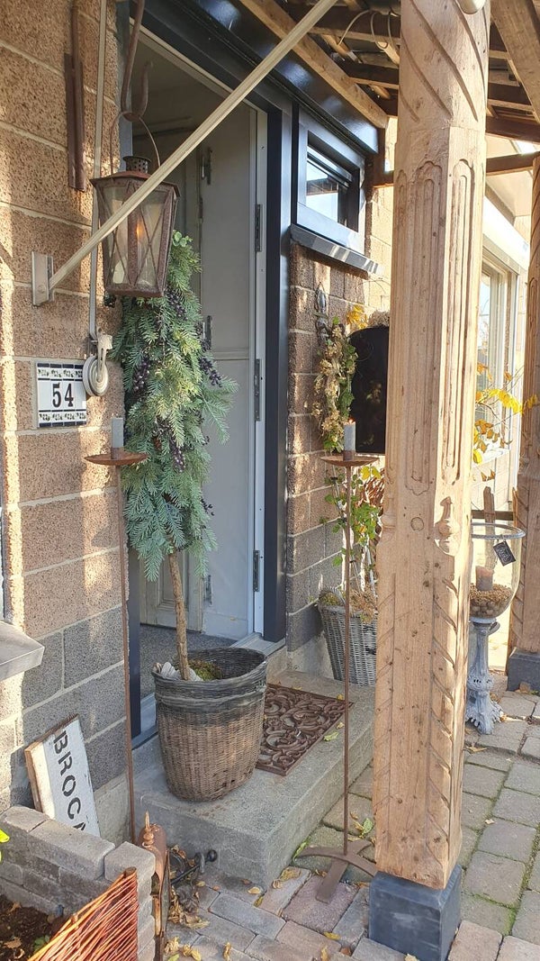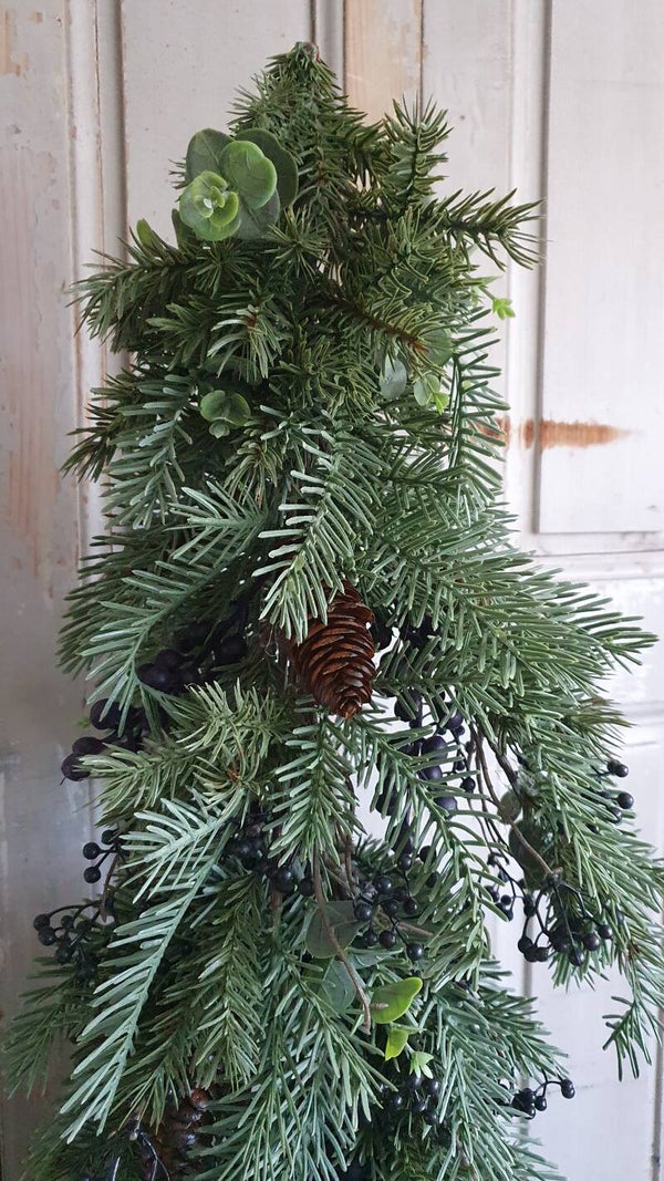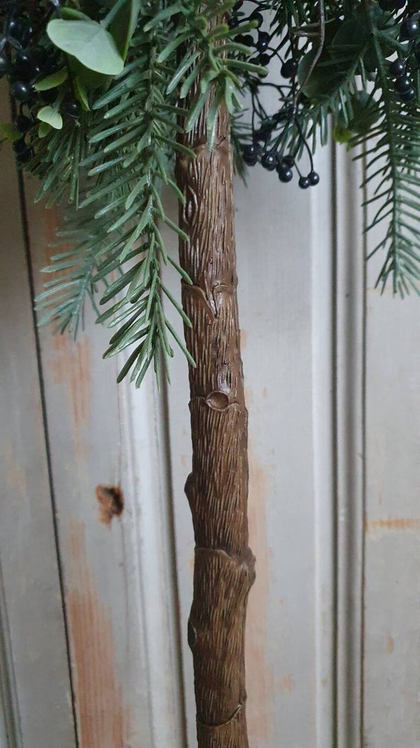 Prachtig smal kunstboompje incl antracietkleurige pot. Vol boompje incl dennenappels en blauwe en zwarte bessen. Boompje is demontabel in twee delen dus makkelijk op te bergen.