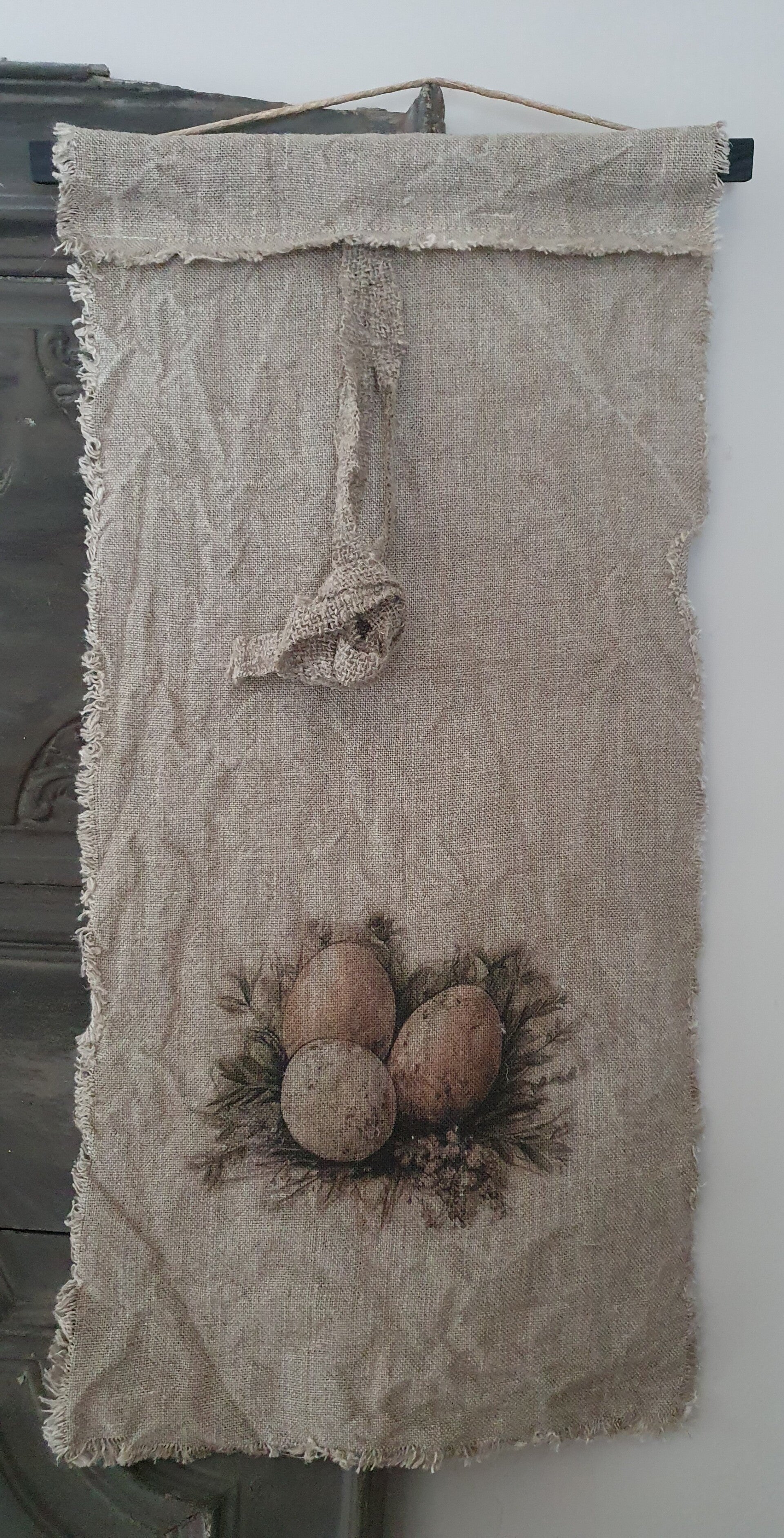Shabby doek met print afgewerkt met een touw aan een zwarte lat.