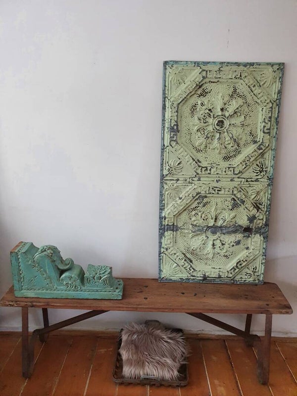 Super mooi groot wandpaneel met sleets zachtgroene verf. Mooi Patina. Ook een unieke blikvanger in huis! Aan achterzijde ophanghaken.