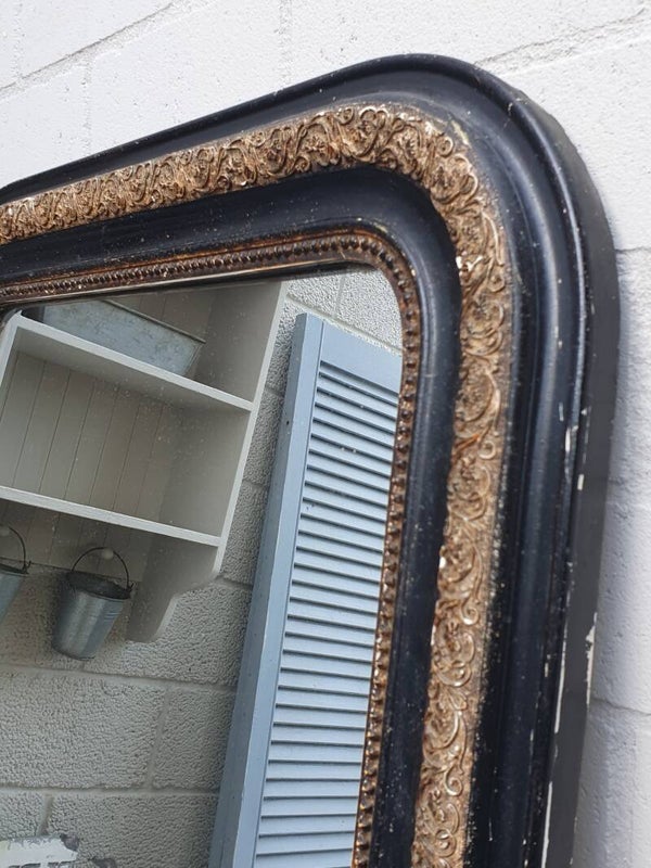 Prachtige spiegel met geleefd uiterlijk. Zware, stevige spiegel. In het glas stukjes verweerd dus echt oud!
