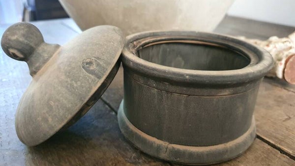 Stoere pot met deksel van Brynxz. Antraciet met een zandkleurige finish.